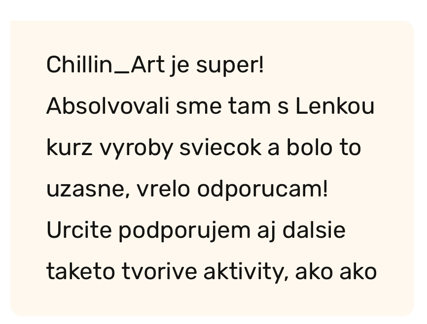 Ak ste už niekedy uvažovali nad tým, že by ste si vlastnoručne vyrobili originálnu dekoráciu alebo si vyskúšali novú tvorivú techniku, naše kurzy v ateliéri Chillin_art v Trenčíne sú presne pre vás. V príjemnej a uvoľnenej atmosfére vás prevedieme celým procesom tvorby – od prvého kroku až po hotový výrobok, ktorý si odnesiete domov.