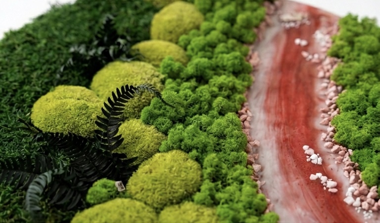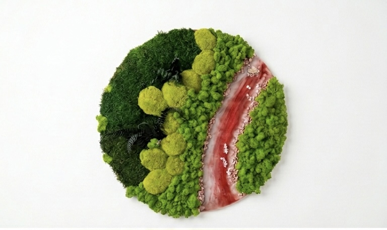 Vneste do svojho interiéru kúsok neskrotnej prírody. Tento ručne vyrábaný machový obraz v tvare kruhu predstavuje dokonalú symbiózu medzi lesným machom a moderným umením. Dominantným prvkom je fascinujúci „prúd“ vytvorený z červenej a bielej epoxidovej živice, ktorý je doplnený o drobné biele kamienky, pripomínajúce koryto divokej rieky. Obraz je vyskladaný z rôznych druhov stabilizovaného machu (plochý aj kopčekový mach) v niekoľkých odtieňoch zelenej, doplnený o tmavé listy papradia, čo vytvára hlboký 3D efekt. Hlavné benefity: • Bezúdržbová zeleň: Vďaka procesu stabilizácie mach nevyžaduje zalievanie, svetlo ani hnojenie. Zostáva svieži dlhé roky. • Unikátny dizajn: Spojenie sýtozelenej textúry a lesklej červenej živice vytvára neprehliadnuteľný kontrast. • Prírodná akustika: Machové obrazy prirodzene pohlcujú hluk a zlepšujú akustickú pohodu v miestnosti. • Umelecký originál: Každý kus je vďaka ručnej práci a prírodným materiálom jedinečný.