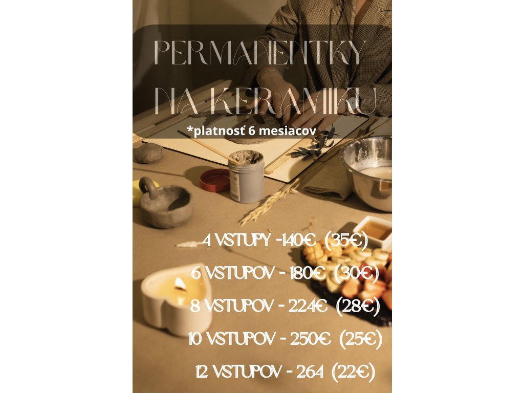 Čím viac vstupov si zakúpiš, tým výhodnejšia je cena za jeden. Permanentky odporúčam hlavne tým, ktorí už majú za sebou aspoň úvodný kurz a chcú si keramiku užívať pravidelne.